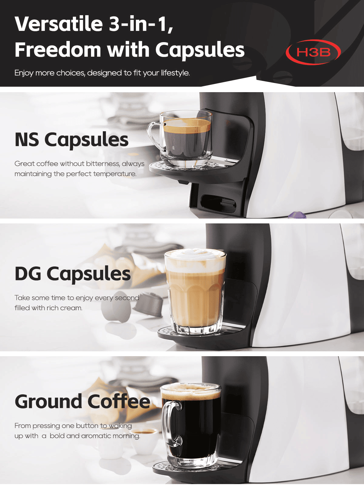 Multifunctional and cost-effective! 4-in-1 coffee maker with brewing cups compatible with 3 or 4 main coffee systems. All-in-one machine for espresso, Americano, and capsule coffee.